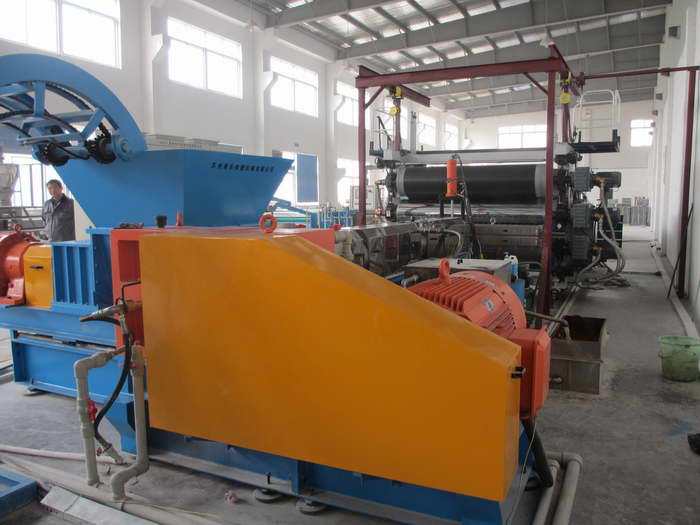 加压式密炼机→自动不锈钢提升机→强制喂料机→GLD单螺杆→2500mm成型模具→三辊挤压表面处理→牵引机→板材电晕处理?→?切割机?→?堆放?