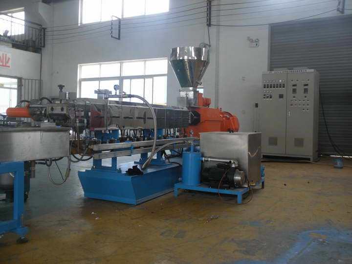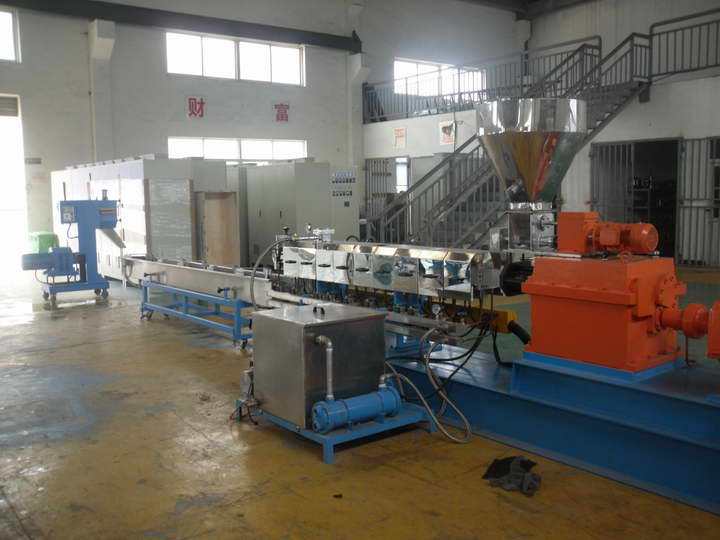 塑料加玻纤造粒机工艺; 高混机----螺旋自动上料机------双螺杆造粒机-------冷却水槽-------吹干机-------切粒机;