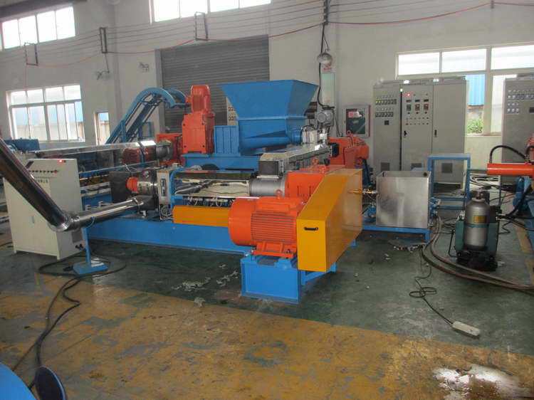 密炼机--自动提升机--推拉式锥双喂料机--双螺杆挤出机--单螺杆挤出机--液压板式自动换网--风冷模面热切造粒辅机--一级旋风分离器--二级旋风分离器----风冷振动筛(2.5m) --风吹料仓一套