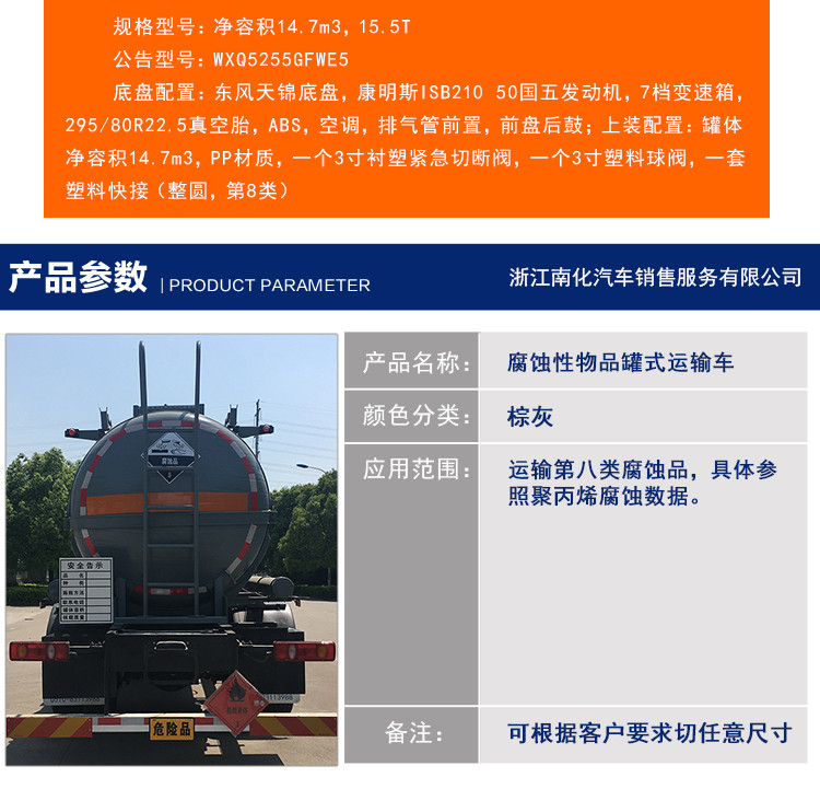 机电之家网厂家浙江南化防腐设备有限公司为您提供浙江南化 15方盐酸槽罐车 液碱 次氯酸钠 化工液罐车 腐蚀品罐车的详细产品价格、产品图片等产品介绍信息,您可以直接联系厂家获取浙江南化 15方盐酸槽罐车 液碱 次氯酸钠 化工液罐车 腐蚀品罐车的具体资料,联系时请说明是在机电之家网看到的。