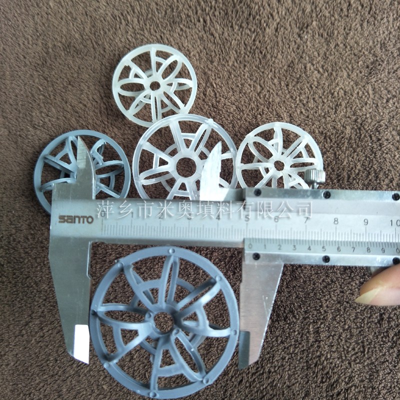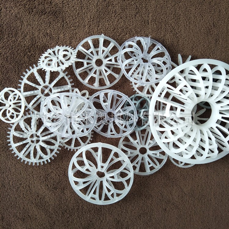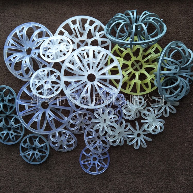 塑料花环填料早是由美国A.J.Teller1954年研制开发出来的,故而常称之为泰勒花环(TellerRosette)。由于填料的空隙处能有较高的持液量,可使塔内液体的停留时间较长,从而增加了气液两相的接触时间,提高了填料的传质效率。 花环填料也称梅花环填料塑料花环填料是由12个小圆环按径向排列而组成的一个大扁球体,很类似于一个螺旋形弹簧首尾相接绕成的一个圆球体。有的小圆呈A字;有的在小圆和大圆边沿还带有齿;有的外围没有大圆圈,只有里面的小圆组成等,客户可根据各自的要求订购不同种类的花环。