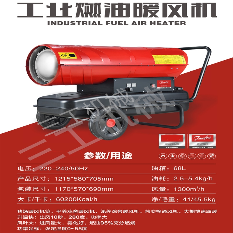 【燃油暖风机】作用 燃油暖风机主要用途是对工业或者商业场所进行采暖,也用于干燥一些产品或者满足工艺要求。顾名思义,暖风机是对空气进行加热的。 目前的采暖方式各种各样:地暖、辐射、暖风、对流等等。能源的选择也很多,传统的燃煤,普遍的电采暖,目前兴起的燃油燃气采暖。在各种采暖方式中,空气采暖是比较舒适的,而暖风机是 普遍的空气采暖方式。暖风机可以提供洁净干燥的热空气,对整个空间加热,温度均匀。