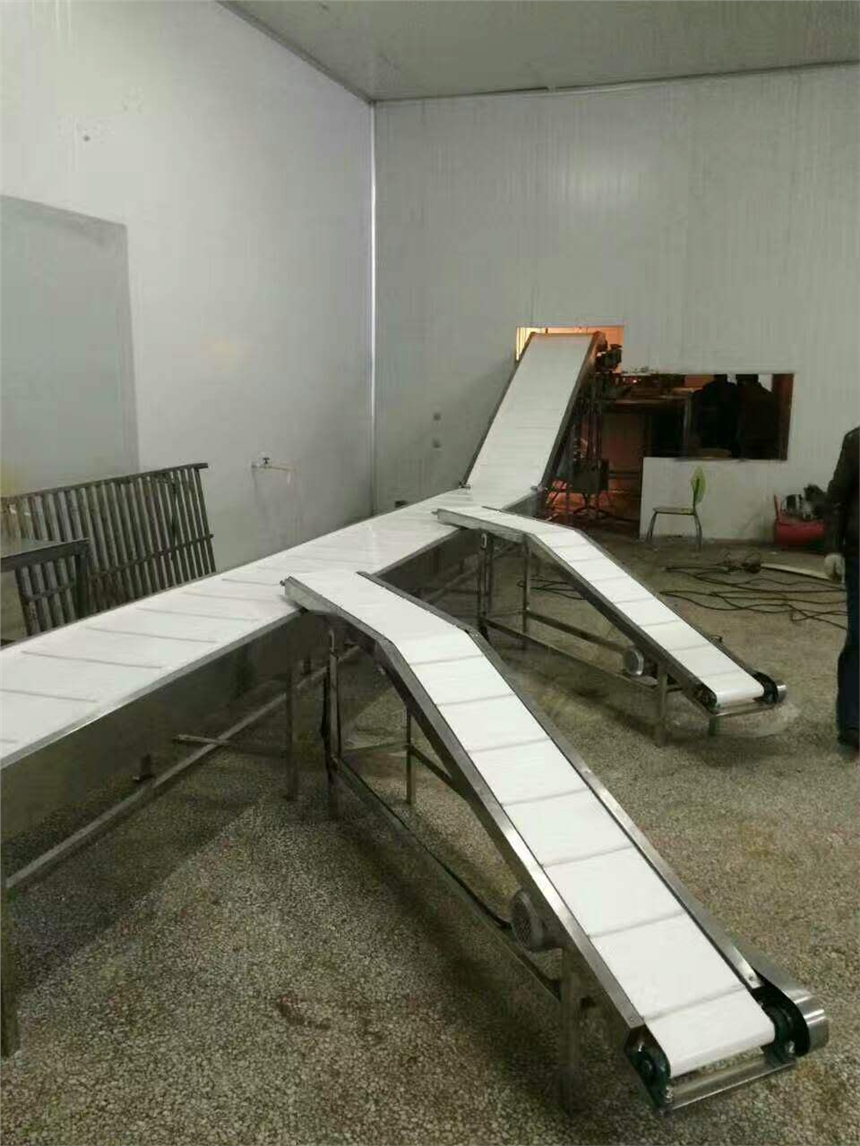 输送机是我公司生产的一种专门用来在生产过程中运输食材原料的设备,食材通过输送机输送到各个设备中完成加工,相比以往需要通过人工运输来言,输送机省去了人力物力,大大节省了人力劳动强度,输送机采用不锈钢材料制作,保证了食材在运输过程中不会被污染,符合了食品卫生要求,在加工完成后也方便清洗,保证以后的生产卫生,结构简单,角度可调,使用维护方便。输送机在运作过程中可与多种设备联合使用,从一个设备出马上从运输到下一个设备中,节省时间,提升效率。另外可根据客户需求机客户的场地大小定制客户需要的输送机,也可定制输送机的长度,材质及样式。在运输过程中也可根据需求调整输送机的速度以此来配合整个生产过程的流程。