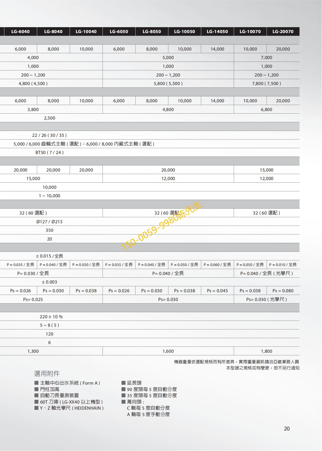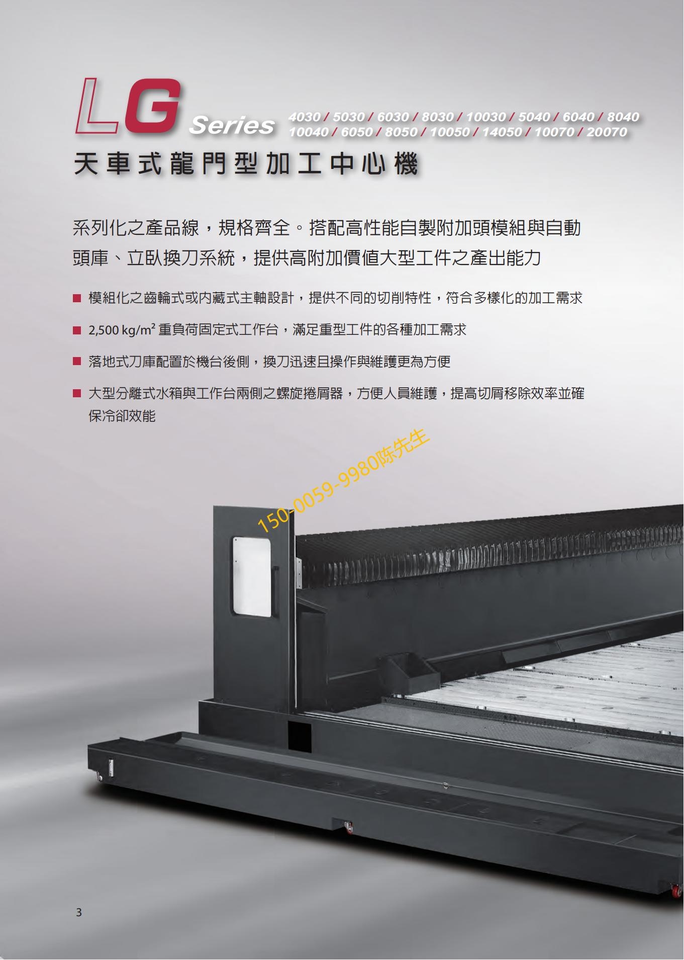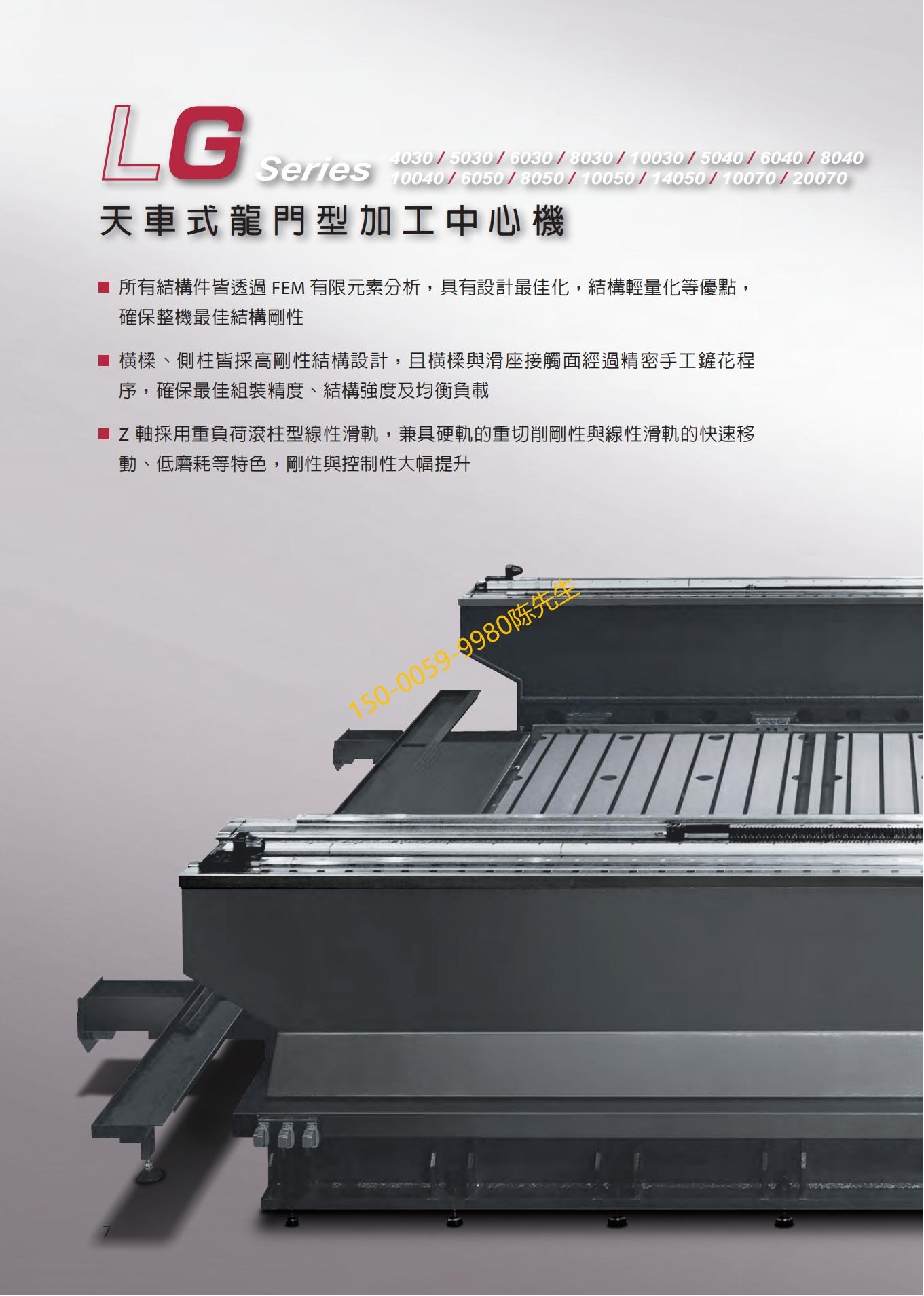 結合模組化設計理念與獨家技術,提供 LG 系列商品化超大型加工機之能力,並領先台灣業界推出 7,000 mm 橫樑之超大型加工中心機「 LG-20070 」