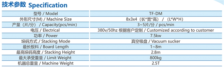盘启动,真空吸盘抓起板料转移设计的位置上实现堆垛起来,堆垛高度机器可适应调节,堆垛