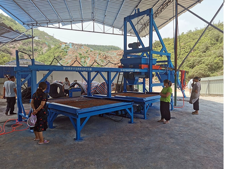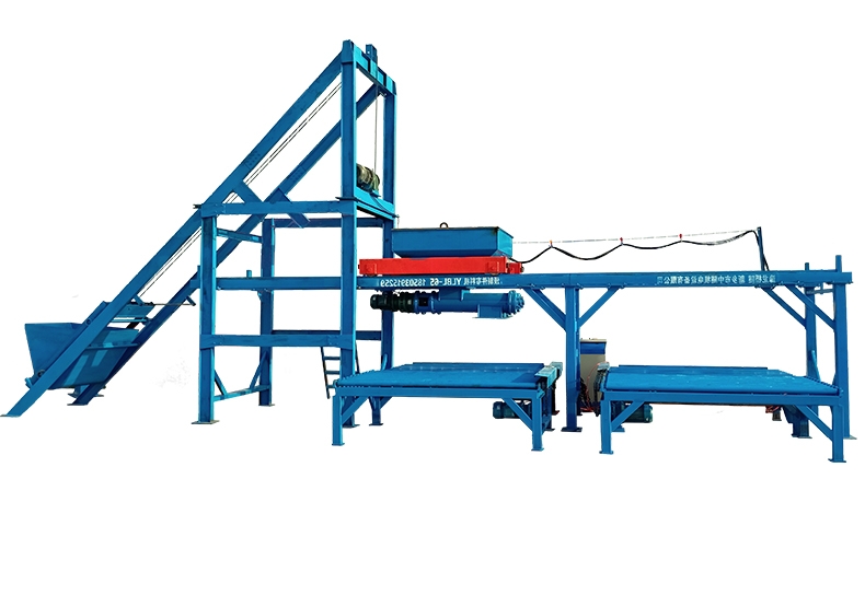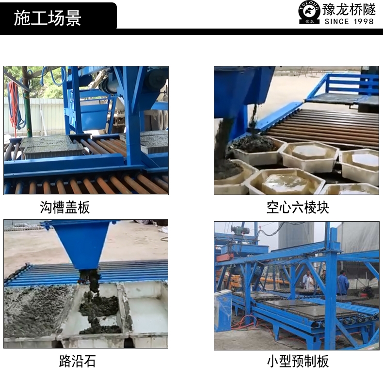 动作说明: 1、斜拉上料负责从罐装车中接混凝土,讲混凝土斜拉提升至移动接料系统; 2、移动接料系统内含有自动称重系统和双螺旋下料系统; 3、振动称型系统内含高频率振动器,快速振动成型; 4、智能操控箱控制整套设备所有系统运转,触摸屏操作,简单,快捷。 5、滚动输送:输送、积累成型预制块,转运晒场时一次转运多块,提率。 6、清洗踏步:休息期间方便工作人员清洗移动接料系统内残余混凝土。 小型预制构件生产线 水泥制品机器 小型水泥砌块预制设备。