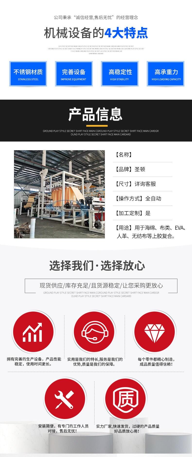 本机使用热熔胶喷出,附着在材料表面。通过后道压辊将两层材料进行压合贴合,常见的贴合材料有珍珠棉、无纺布、玻纤布、编织布、衬布、羊羔绒、麂皮绒、皮革、海绵等贴合牢度有要求的一些材料。