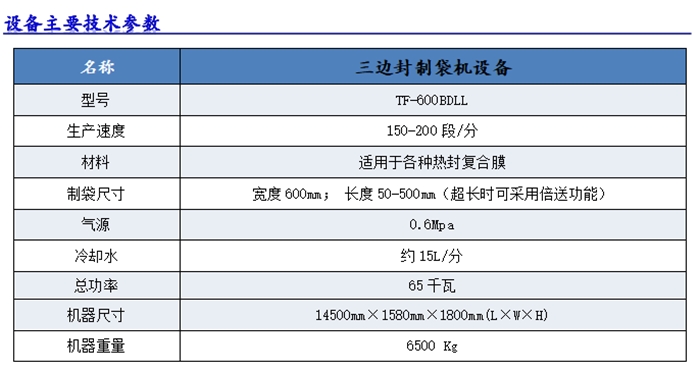 TF-600BDLL 三边封、贴底站立袋、连底站立袋、拉链制袋机由三边封制袋机、双拉链热封部件、双站立贴底部件、对折放料架与多媒体工业控制机计算机加交流数字伺服等系统组成。