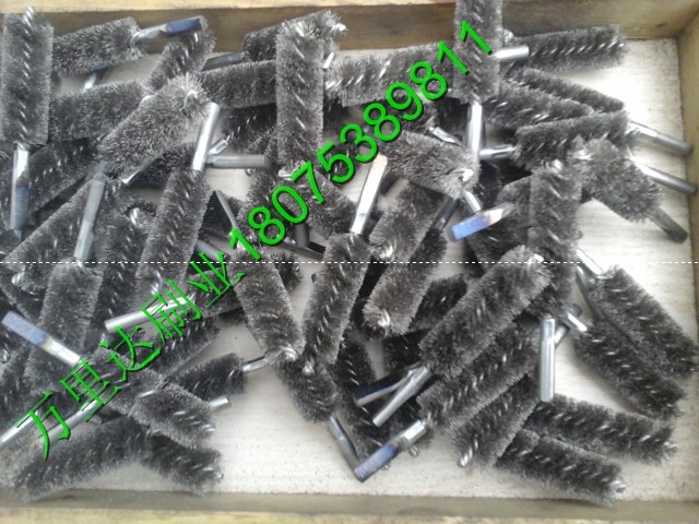 绞线刷扭线刷:单位:mm; 1、钢丝铜丝绞线刷材料:铜丝、不锈钢丝、碳钢丝(丝径ф0.06—ф1.0)、铁线; 可制作双股线、三股线、四股线绞线刷,最小外径可做到4mm;机械零件深孔、相关孔、同心大小孔相连处在加工过程中都会产生毛刺,去除毛刺可以提高零件品质,是机械加工工艺重要一环。利用通道刷处理小孔毛刺是必要,经济,高效率的方法。 2、洗瓶刷材料:尼龙丝(丝径ф0.06—ф1.0)、猪鬃、棕丝、剑麻、不锈钢线;可制作双股丝、三股线、四股线绞线刷,最小外径可做到1.2mm。洗瓶刷用于清除试管瓶、塑料瓶、玻璃瓶、刷毛有尼龙、猪鬃等材料。可按瓶径大小制作毛刷。 管道刷,英文为 tube brush ,又叫试管刷,管子刷,清孔刷,扭丝刷,内孔刷,内管刷,清槽刷等,是一种应用非常广泛的产品,属于抛光清理除、除锈功能的范畴。主要是由铁丝(钢丝)作骨架,加以扭制.上面带有许多排列整齐,向外伸展的细刷丝构成。刷丝材料有尼龙丝,纤维毛,猪鬃,钢丝,铜丝,磨料丝等.管道刷一般使用在液压阀内控去毛刺、缸套活塞内控抛光、钢桶清洗、试管清洗、锅炉清除污垢、金属零件内孔去毛刺等 管道刷的适用范围.
