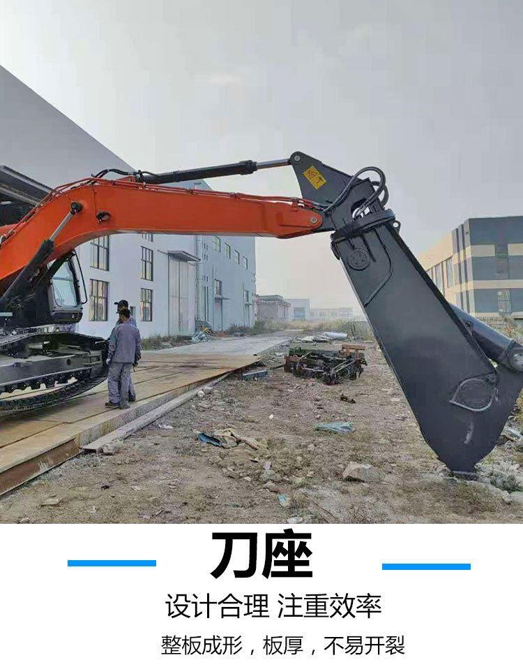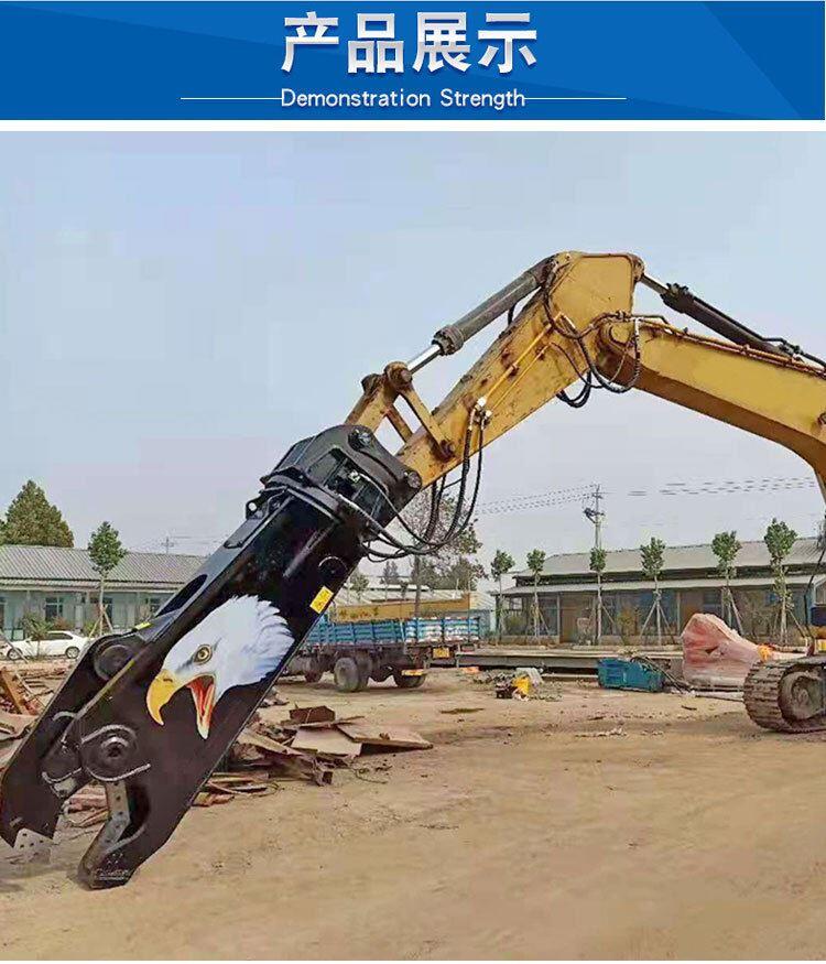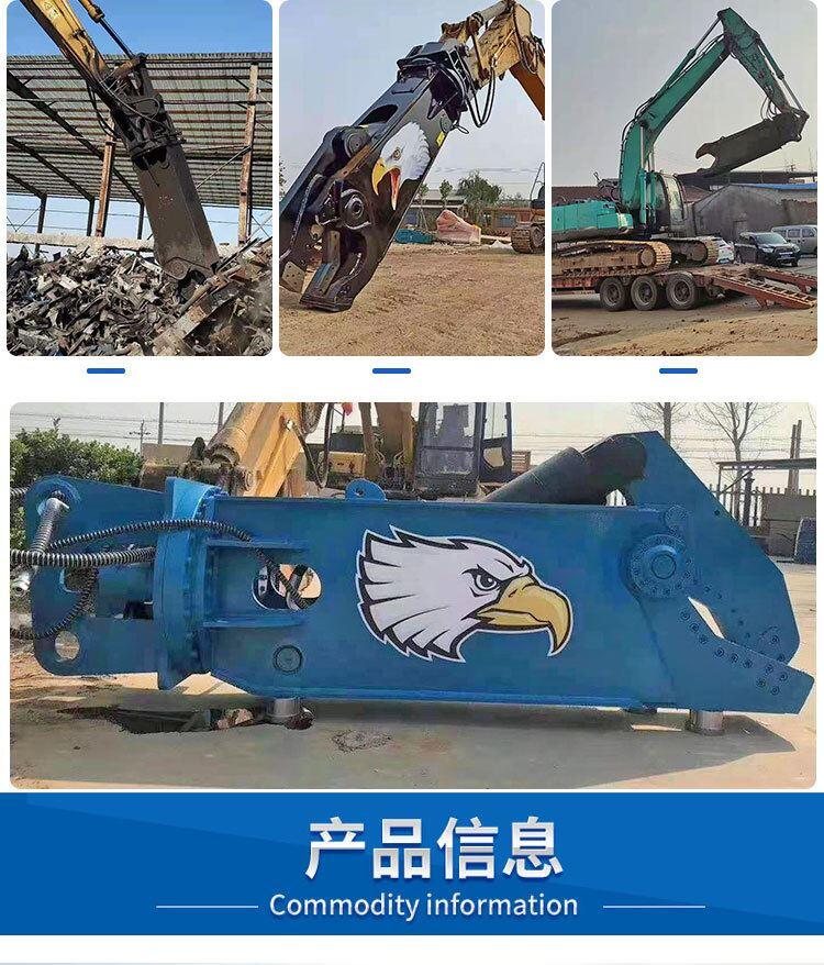 属于重型的液压剪,大油缸,安装于挖掘机上使用,用于拆解废车、剪钢筋、钢材、罐、管子等废料钢,此类剪刀适用在不同的操作中,包括钢结构的破拆,废料钢的处理等应用中,能切割 铁制材料,钢材,罐,管子等,鹰嘴剪独特的计和创新方式保证了高效运作和强大的切割力,较普通液压剪性能超出 15%,是挖掘机液压剪中剪切力较大的一种。