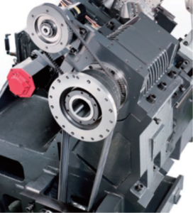 > 以专用高性能 V 型皮带传动主轴系统,可降低马达产生热量对主轴精度的影响。经由精密调校之皮带轮减速比,让马达与主轴最大转速同时达到,从而降低马力输出之转速并提高扭矩。