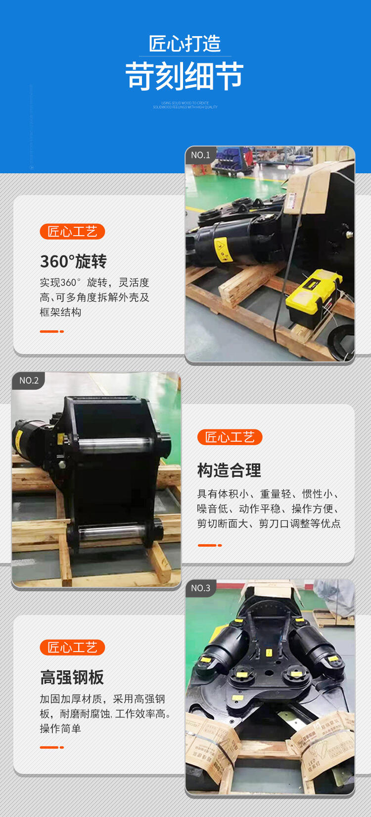 机械式液压剪是挖掘机斗臂油缸作用于连杆摇臂进行伸缩,对上剪刃施以动力,下剪刃固定在斗杆上,即可实现剪切作业,无需使用其它辅助油缸和液压系统。