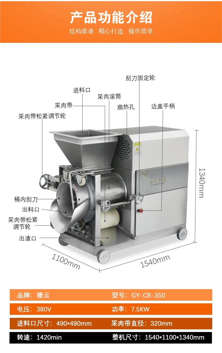 350型工业款采肉机,这款设备是一台大型的鱼肉、鱼刺、鱼皮分离的设备,其主要目的问提取净鱼肉,把鱼刺、鱼皮这些不需要的杂质去除,机器加工效率高,时产可达1.5吨左右,机身采用304不锈钢板材制作,更加耐腐蚀,使用效果好。