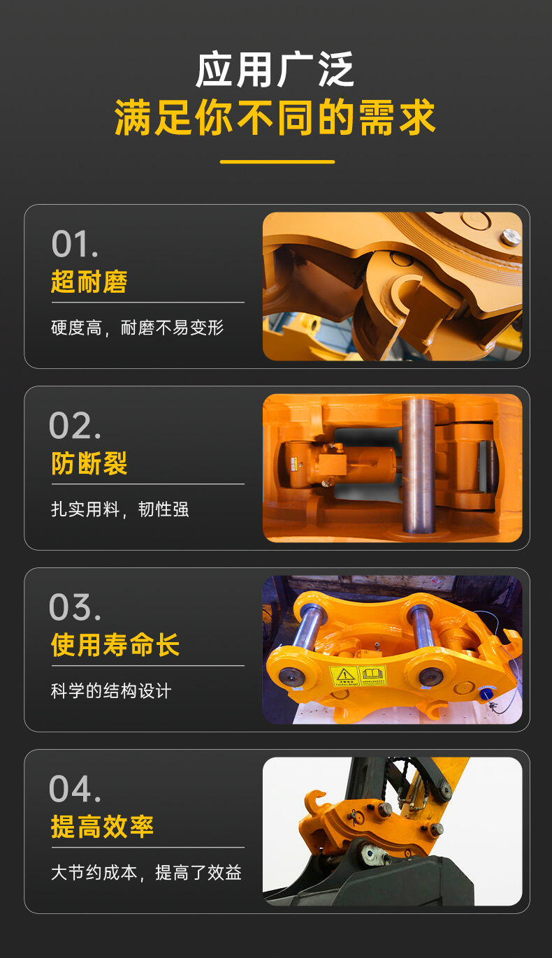 3、挖掘机配置件无需改装,也不用拆卸销轴就能更换,因此安装迅速,能极大提高工作效率。