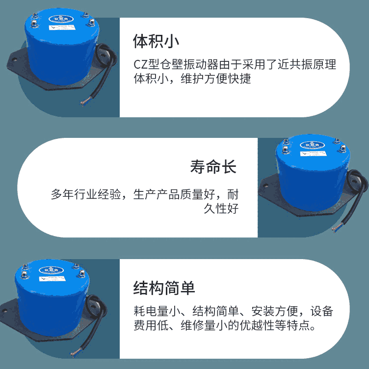 料仓下料高频振动电磁仓壁振打器 CZ600防堵塞振动器有效地消除物料由于内磨擦,潮解,带电,成分偏析等原因而引起的堵塞,搭拱现象,勇梅机械电磁振打器广泛地应用于矿山,冶金,化工,建材,机械等各行业中。电源电压只需两相220V/380V即可,可频繁启动停止连续工作。我们也可以根据用户要求可制作成封闭式防尘仓壁振动器。