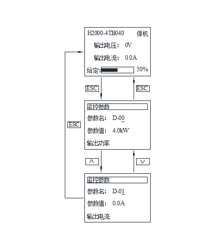 返回键。在状态监控模式时,按下该键,进入状态参数、监控参数查询模式,可以查看的运行状态参数。在其他任何操作状态,单独按该键将返回上一级状态。 |