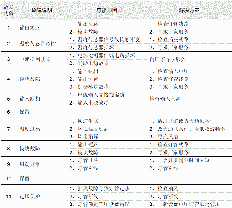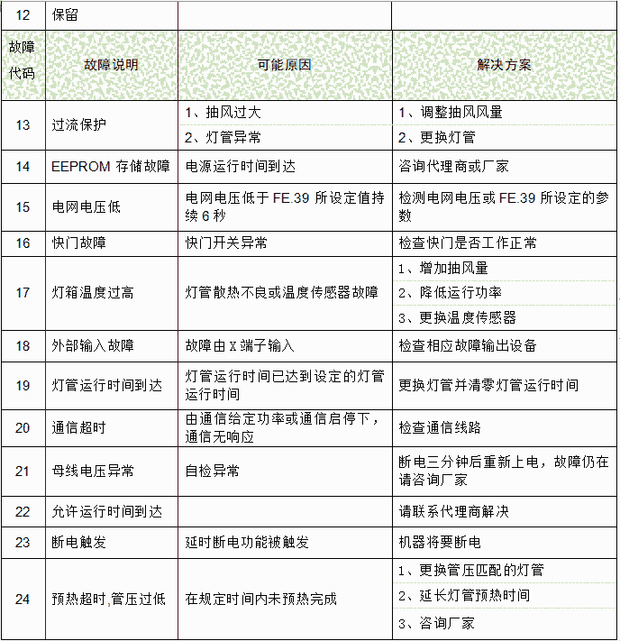 本系列机器有丰富的故障报警及告警功能,故障报警是指设备发生故障,机器不能继续运行。报警发生后,机器封锁输出,操作面板故障指示灯亮,显示故障代码及故障说明。告警则是机器当前的工作状态超出了正常工作范围,提醒用户机器可能存在故障。告警发生后,机器继续运行,操作面板交替显示告警代码,故障指示灯闪烁,当机器工作状态回到正常状态后,告警自动撤消。通常而言,灯管在激发阶段或由低功率迅速切换到全功率伴随的短暂过流而发生的告警是正常现象。
