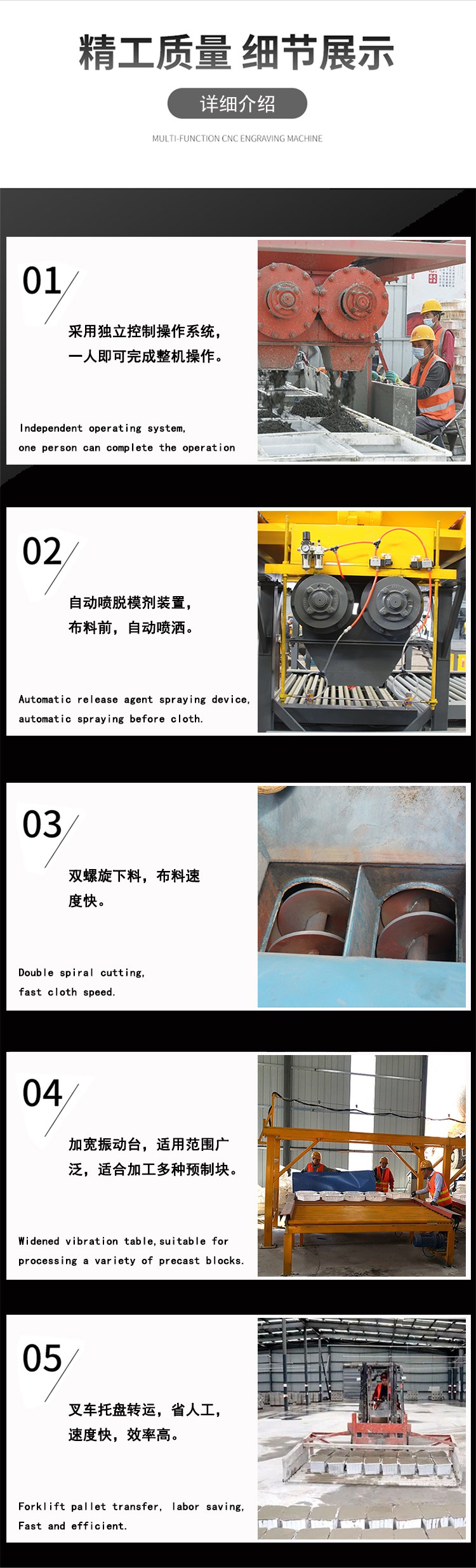 高铁预制件生产设备有以下特点:整个设备采用摇杆控制,一人即可操作整机,实现了小预制件生产效果的化,且可以可能的节省投入费用。小型预制构件布料机 路沿石预制生产线 预制块脱模机