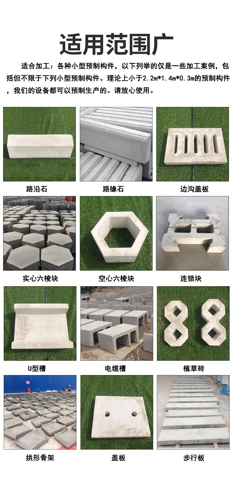 的振捣台尺寸是2.2m*1.4m,所以理论上在这个范围内的小型预制构件都是可以振捣生产的。一机多用,客户更换模具后,可以振捣生产超200种小型预制构件块。多用于各个铁路/公路项目的小型预制构件厂或者各个水泥制品厂。