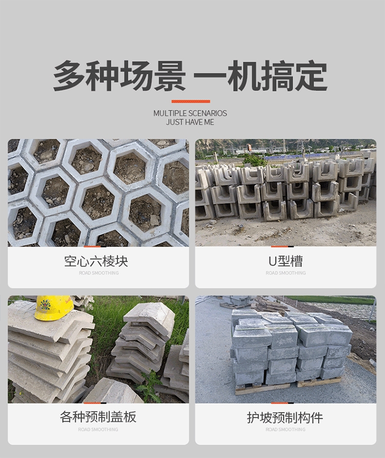 我厂主营:,,,,。型号有:45型、65型、100型、200型,可生产边沟盖板、空心/实心六棱块、路沿石、护坡砖、拱形骨架、U型槽等200多种规格的小型预制构件,一机多用,生产效率是纯人工的10倍以上。