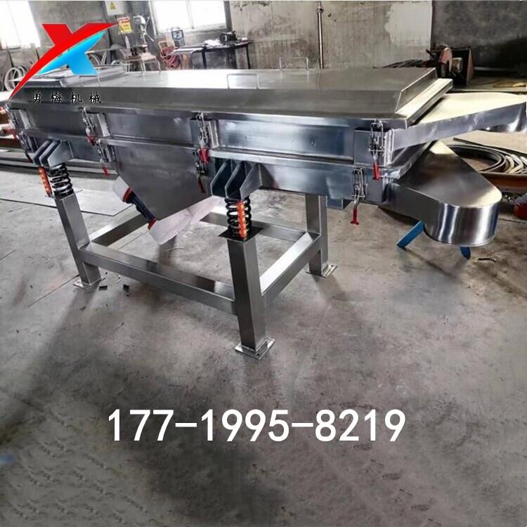 除杂振动筛是由两台Y系列卧式振动电机作为动力源,当两台卧式振动电机做相对运转或相反运转时(不可顺向运转),两台振动电机产生相同方向的激振力,多余的激振力进行相互抵消,得到相同激振力后为一股同方向振动力沿角度导力板传递给筛箱内的筛网上,强迫物料做向前匀速跳跃式运动,通过筛箱内不同筛网目数孔径进行分级达到预期粒度范围的成品,并通过振动筛前段不同方向的出料口依次排出,完成粒度分级,除杂等工艺要求。