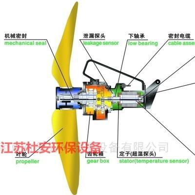 江苏杜安环保低速推流器每台潜水搅拌器/推进器的每根电缆配置电缆吊挂网兜,电缆吊挂网兜的材质为316不锈钢或更优质材料。