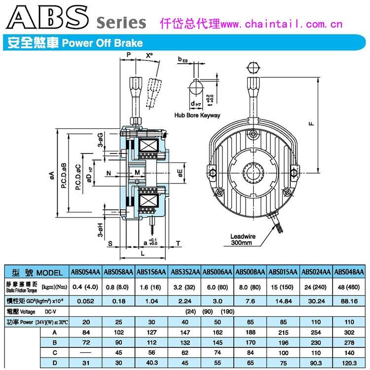 4牛米安全刹车器ABS0S4AA,这是一款由台湾仟岱有限公司生产的断电式失电安全刹车抱闸,工作电压为DC24V,得电刹车器打开,电机或者负载轴可以自由转动,断电刹车抱死,电机轴或者负载轴被锁住。一般用于急刹急停,也可以用于静止保持,起到一个安全保护的作用。