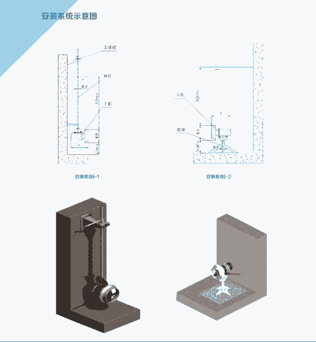 潜水搅拌器为成套装置,包括安装系统和提升装置。安装系统应由方钢导杆和顶部和底部支座、转向栓等组成,可自由调整搅拌器的提升和下降,并可在不排空水池的情况下拆卸和安装搅拌器。通过转向栓,在平台上就可以操纵导轨和搅拌器在水平面 360 度范围内任意角度旋转。搅拌器装在一个可在导杆上滑动的支架上作为一个整体,该支架必须能够承受搅拌器的整个重量和造成的所有推力。