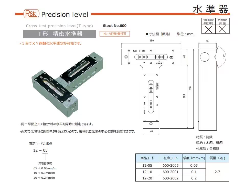 进口日本RSK 新泻理研水平器 T型水平仪 机床调试水平尺 600-2002