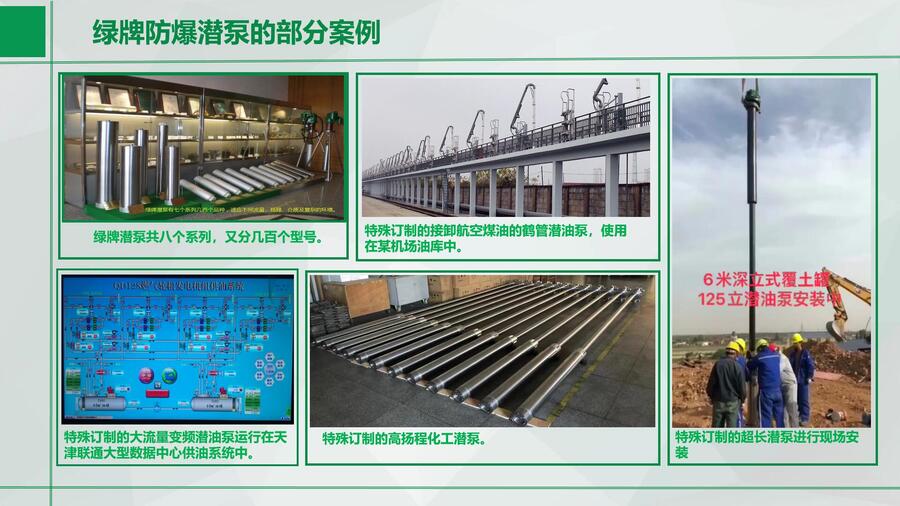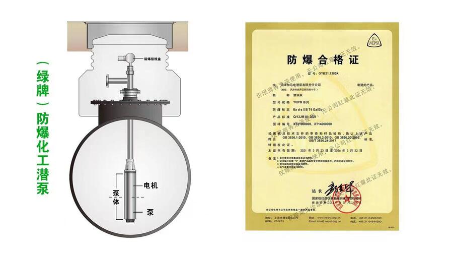 绿牌新型防爆潜泵,有不锈钢材质、碳钢材质,适用于地下罐/地埋罐/地下储罐,电机叶轮统称为泵体,潜沫在介质中运行,其轴只有几百毫米,运行平稳,无噪音,无抖动,终身免维护。电机定子与转子之间可以过液,起到给电机降温和轴承润滑的作用,决定了电机的超长使用寿命。取得EXdsⅡBT4