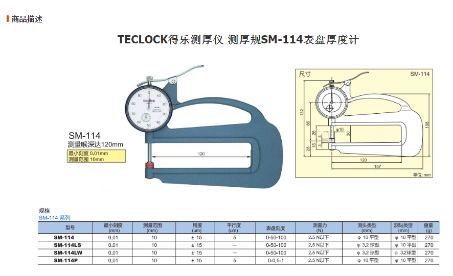 日本得乐teclcok 针盘式厚度计 SM-114 手持式测厚仪 厚薄规原装正品