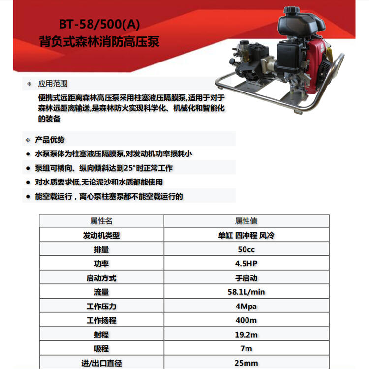 减震背架高扬程水泵BT-58/500(B) 森林消防高压泵带水冷隔膜泵