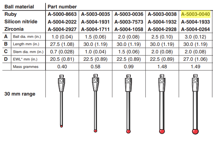 雷尼绍测头 直测针红宝石测球 A-5003-0040碳化钨测杆原装正品