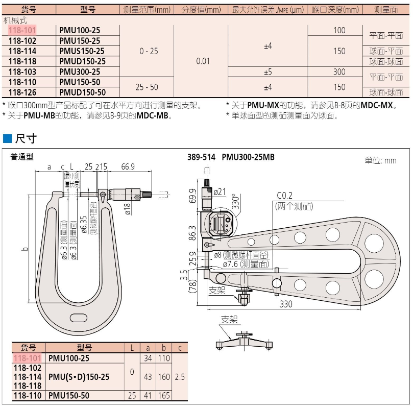 日本Mitutoyo三丰118-101 深弓架壁厚千分尺 板材千分尺外径卡尺