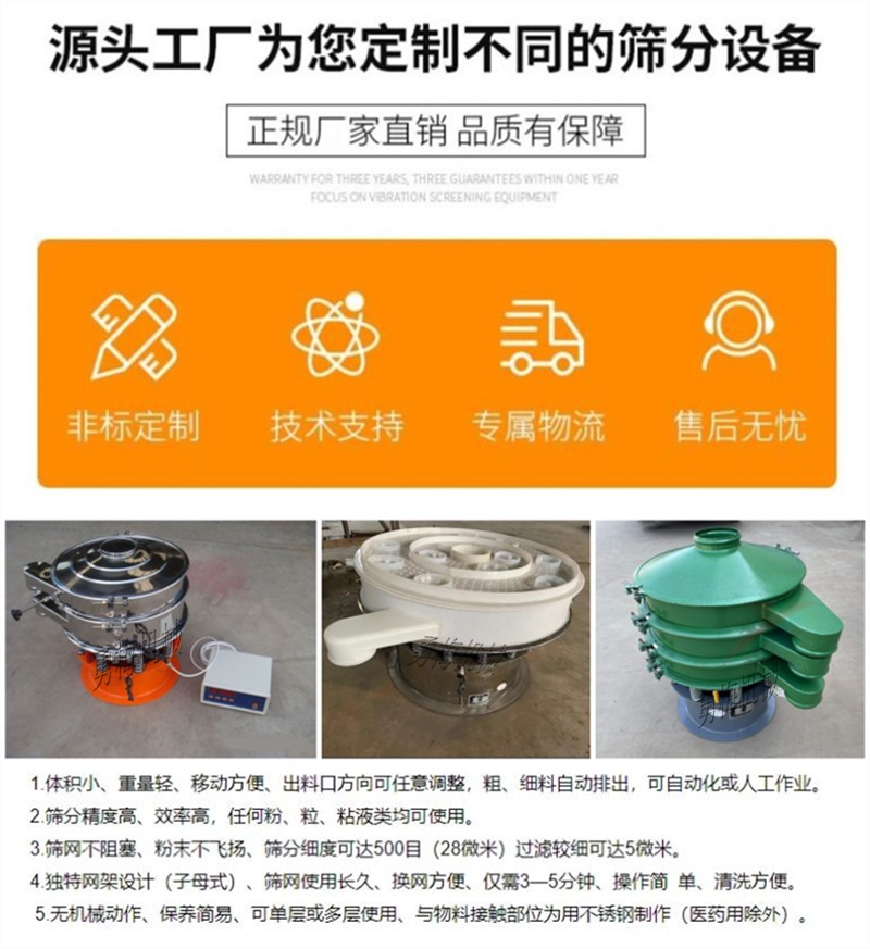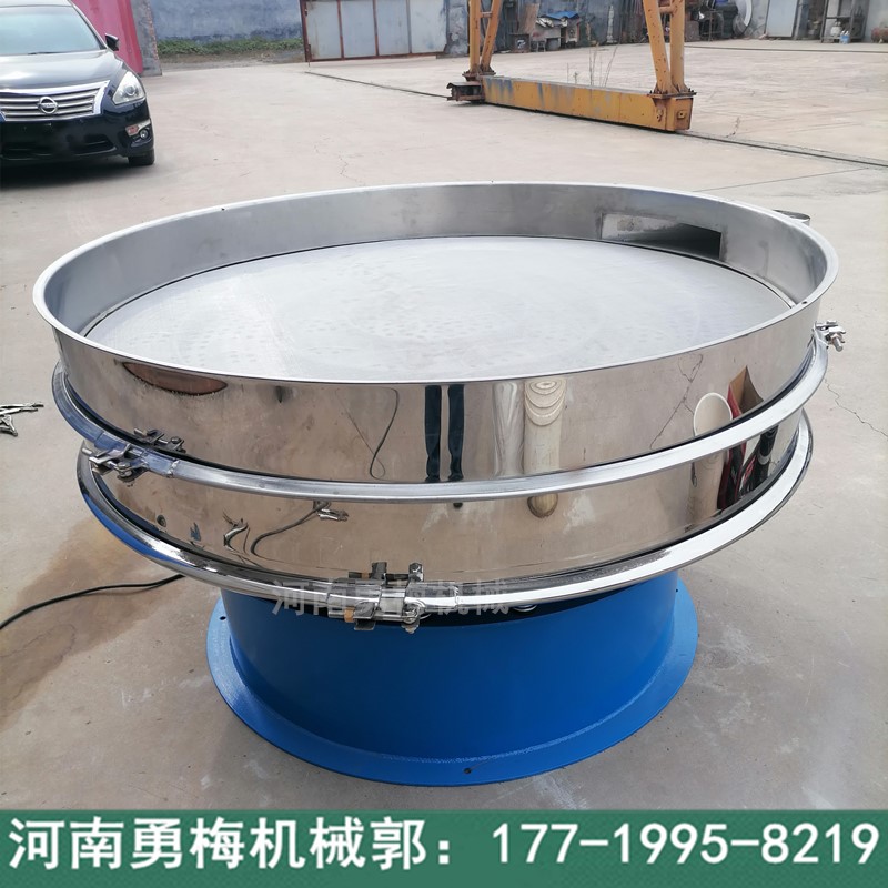 旋振筛分级就是把颗粒、粉末分成大小不同的粒子段单台多层式振动筛分机可配1至5层筛网,能连续分选出2-6个颗粒级并控制较窄的颗粒度范围,勇梅机械旋振筛是一种高精度细粉筛分机械,其噪音低、效率高,快速换网需3-5分钟,全封闭结构,适用于粒、粉、粘液等物料的筛分过滤。旋振筛振动体的运动轨迹为一复杂的空间三维曲线,此曲线在水平面上的投影为圆形,在两垂直面上的投影为两相同的椭圆。实际运用中,通过调整振动电机上下两端偏心块的相对相位,可以改变筛面上物料的运动轨迹,从而达到不同的筛分作业目的。