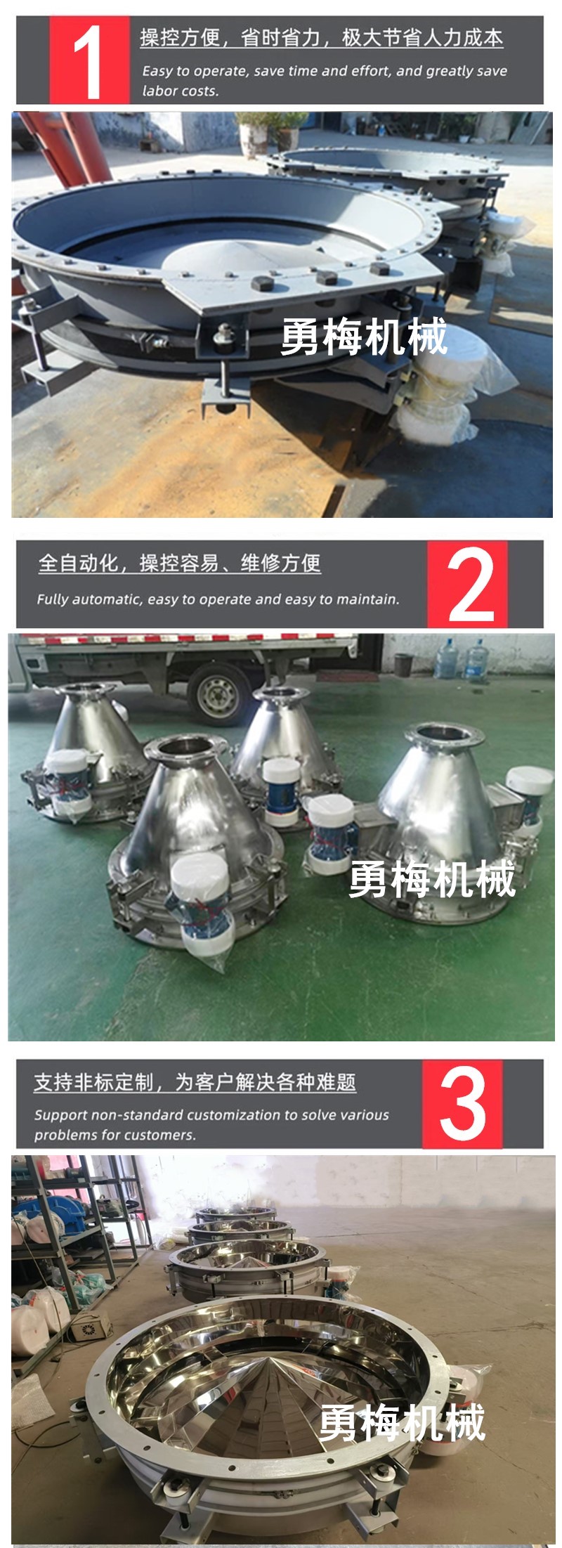 石灰粉粉料料仓仓底防堵活化锥 电机振动排料斗 通过振动,使立简仓内的粉料均匀流出。TDXZ系列仓底振动卸料器是目前常用的卸料器。它采用振动电机产生的振动力,使振动器及内部的球面活化器随之振动,并将振动力通过活化器呈放射状传向物料,从而破坏仓内物料产生的结拱现象,使物料均匀,连续不断的排出当电机停振,排料随即中断。本设备有结构简单、体积小、重量轻、运行平有结构简单、体积小、重量轻、运行平稳、噪音小、能耗低、密封性好、破拱性能强、寿命长、给料量可调、操作维修方便等特点。