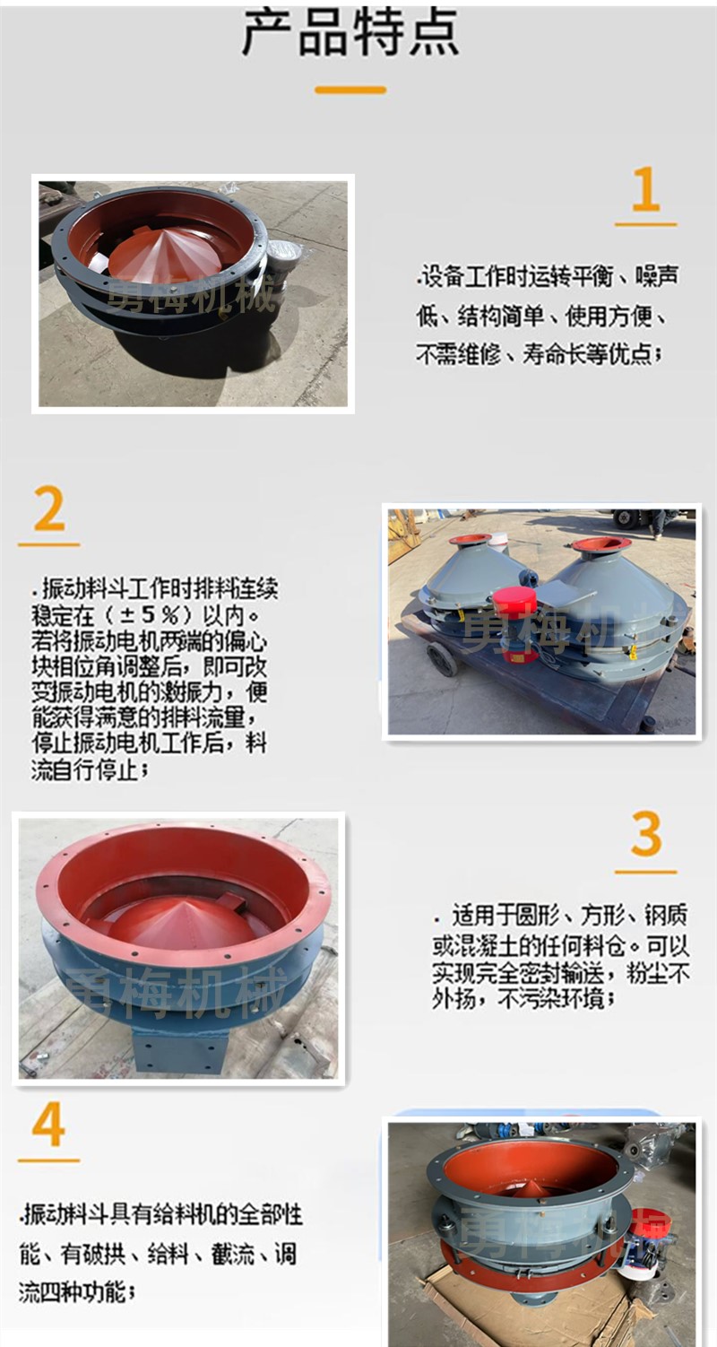 污水处理振动给料斗 锥形破拱料斗破拱性能好,对于料仓内的各种粉状及粒状物料都能实现破拱和连续均匀排料,可消除不同粒度,不同比重的混合物料在进入料仓时的偏析现象。振动料斗是一种安装在料仓下部的新型给料设备,主要用于消除物料起拱、堵塞及粘仓现象,解决料仓排料难题,广泛应用于化工、建材、冶金、机械制造、粮食加工及环保等领域。