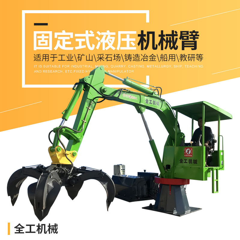 固定式液压机械臂,由液压站、回转支撑系统、大臂作业系统、控制系统及电控柜组成。执行部件可以选用液压液压锤、液压莲花爪、液压剪、抱夹等附具。实现破碎、钳碎、铲、抓、挖、勾、挑、扒等多种功能。该机械臂占地面积小、结构紧凑,作业范围大。可安置在各种场合,改善劳动环境,提高生产安全。