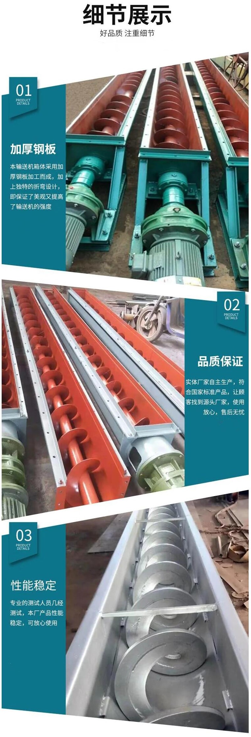水平输送U型螺旋输送机 绞龙给料机U 型槽体:是输送机的外壳,呈 U 型,一般由锰板卷制而成,端部采用法兰连接,具有良好的密封性和整体刚性,能有效防止物料泄漏。驱动装置:包括电机、减速机等,为螺旋轴的旋转提供动力。螺旋叶片:是核心部件,焊接在螺旋轴上,通过旋转推动物料前进。叶片可根据物料特性设计为实体螺旋、带式螺旋、叶片螺旋等不同形式。