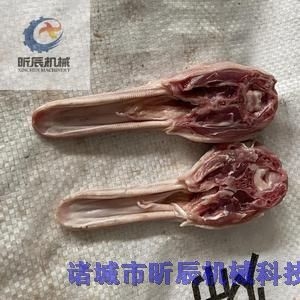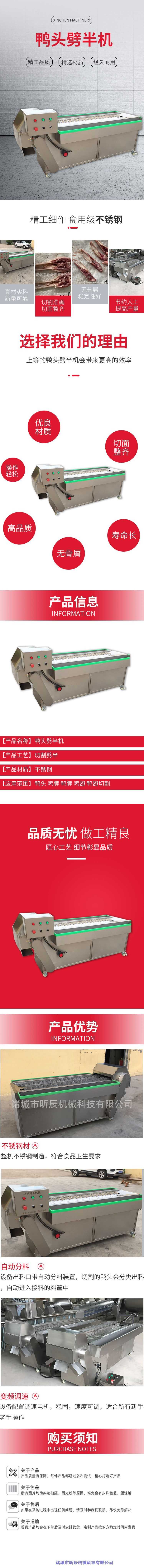 鸭头切半机,劈半机是可以将鸭头从中间开半,节约人工,切口整齐,无骨渣,一小时可分切6000-8000只左右。