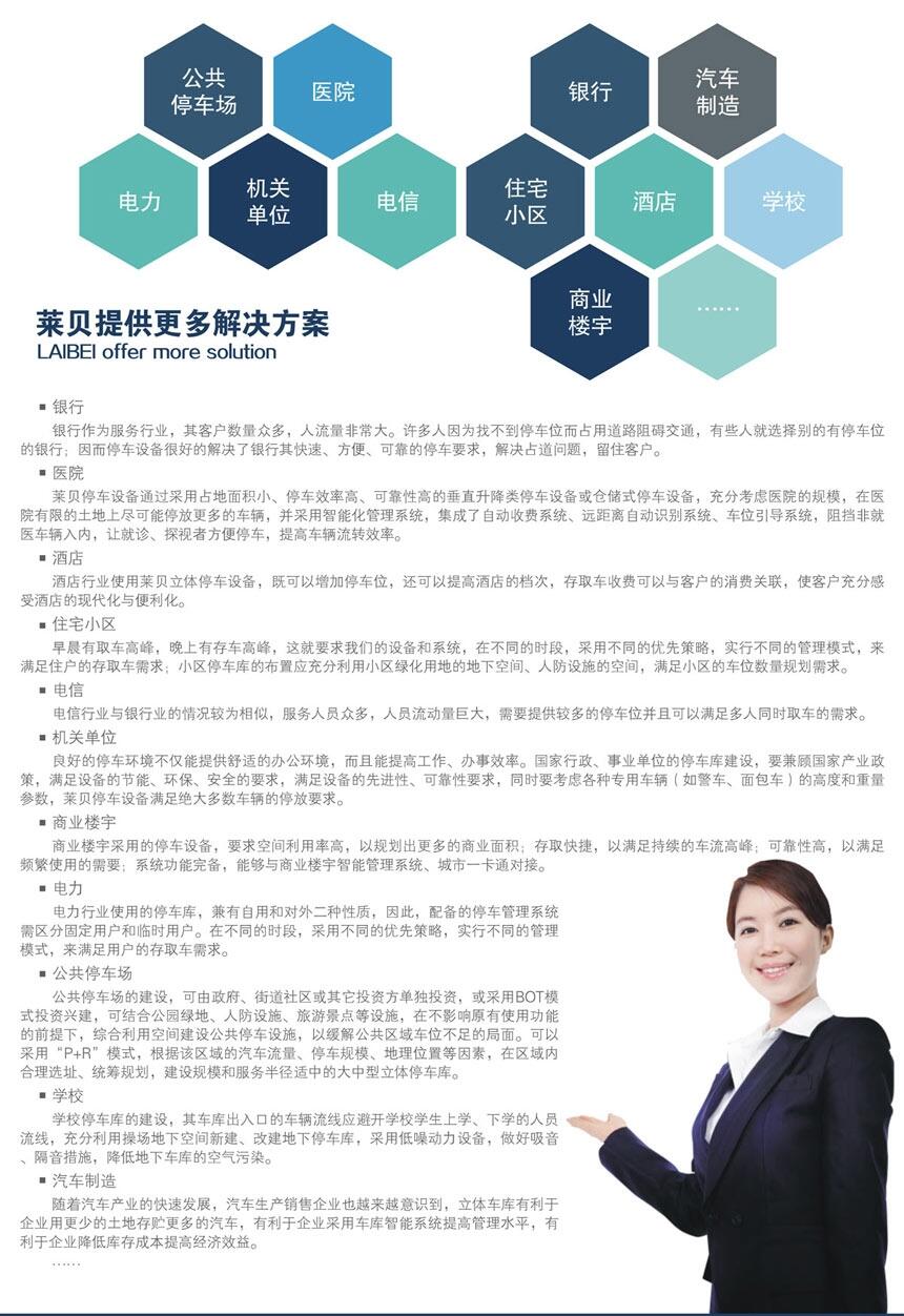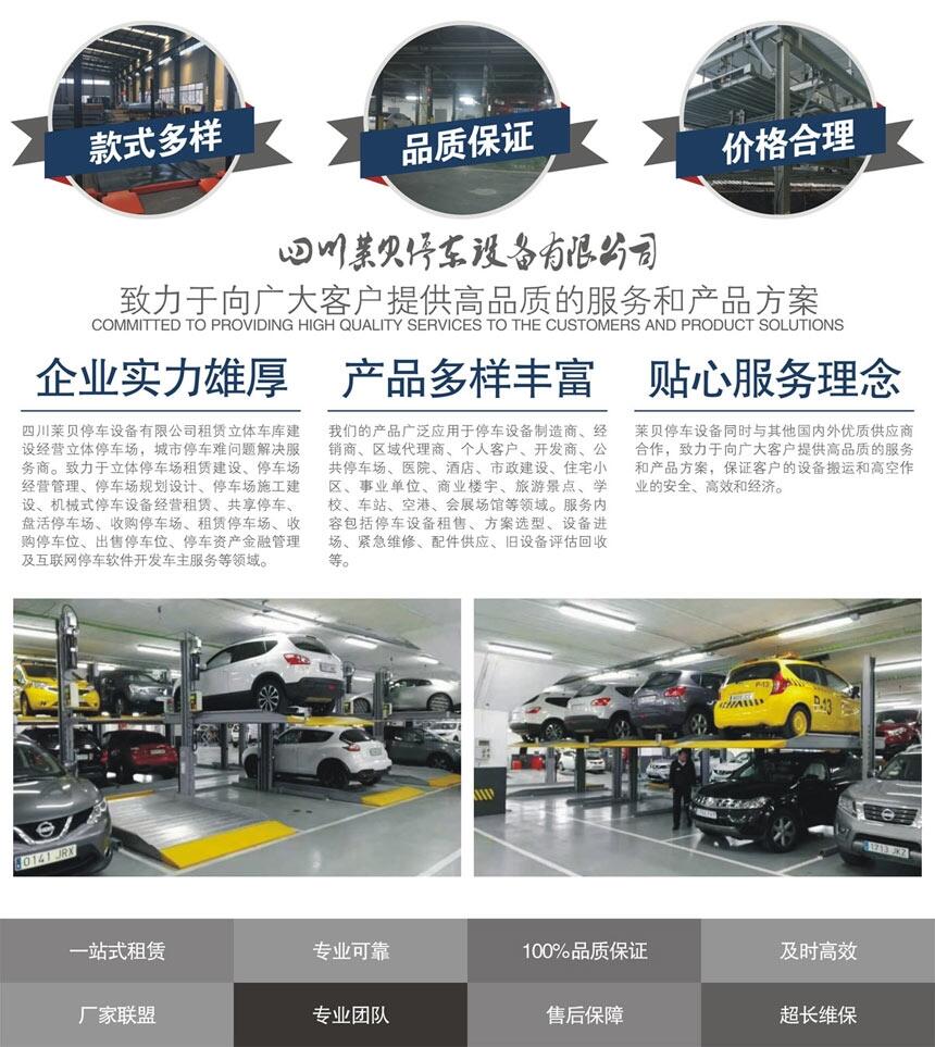 四川莱贝停车设备有限公司致力于四川射洪立体车库租赁、出租升降停车、莱贝机械式立体车库拆除、机械停车设备销售、机械式立体车库设备经营租赁、立体停车场建设、停车场经营管理、停车场规划设计、停车场施工建设、共享停车、盘活停车场、收购停车场、租赁停车场、收购停车位、出售停车位、停车资产管理及互联网停车软件开发车主服务等领域。我们为机场、车站、商场、大学、住宅、酒店、P+R停车等各种停车类型,从一个停车场一个区域到一个城市提供的停车位经营解决方案。公司严格按照ISO9001:2015质量管理体系、ISO14001:2015环境管理体系、ISO45001:2018职业健康安全管理体系要求,优化组织架构,规范内控体系,明确部门分工,积极开拓市场。业务特色鲜明,在市场营销、风险控制、业务创新、人力资源管理等方面均衡发展,形成覆盖全国的业务网络,建立了科学的管理模式。公司与多家机构、设备制造商、服务团队、停车管理等多家企业形成战略合作关系,抓住历史机遇,创造奇迹,在尽可能短的时间内,做大做强做牌。通过持续改进,不断设计并优化停车场方案,为客户提供多元化的立体停车场经营以及技术支持服务,致力于成为国内更具创新力的立体停车场经营提供商。为了响应快速发展的停车需求和引入社会资源优化停车产业结构的号召,莱贝停车设备配合政策,改善车主停车体验,解决城市停车难题,将未来停车产业推向新的领域。公司充分利用人才、技术和设备优势,租赁一系列适合国情的、高的产品。主要有:四川射洪立体车库租赁、出租升降停车、莱贝机械式立体车库拆除、简易升降式、升降横移升降式等。该产品具有占地面积少、空间利用率高、安装方便、能耗低、噪音小等特点,适用于各种场地和建设要求。公司为客户提供立体车库规划计划、施工设计、安装调试、运营培训、技术支持售后、机械停车设备销售、租赁、回收等多项服务,直至客户满意。