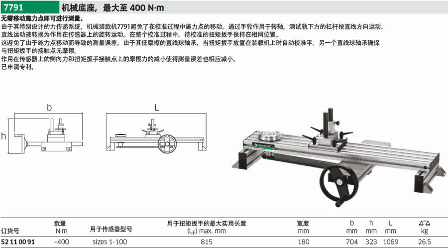 由于其特别设计的力传递系统,机械装载机7791避免了在校准过程中施力点的移动。通过手轮作用于转轴,测试轨下方的杠杆按直线方向运动。