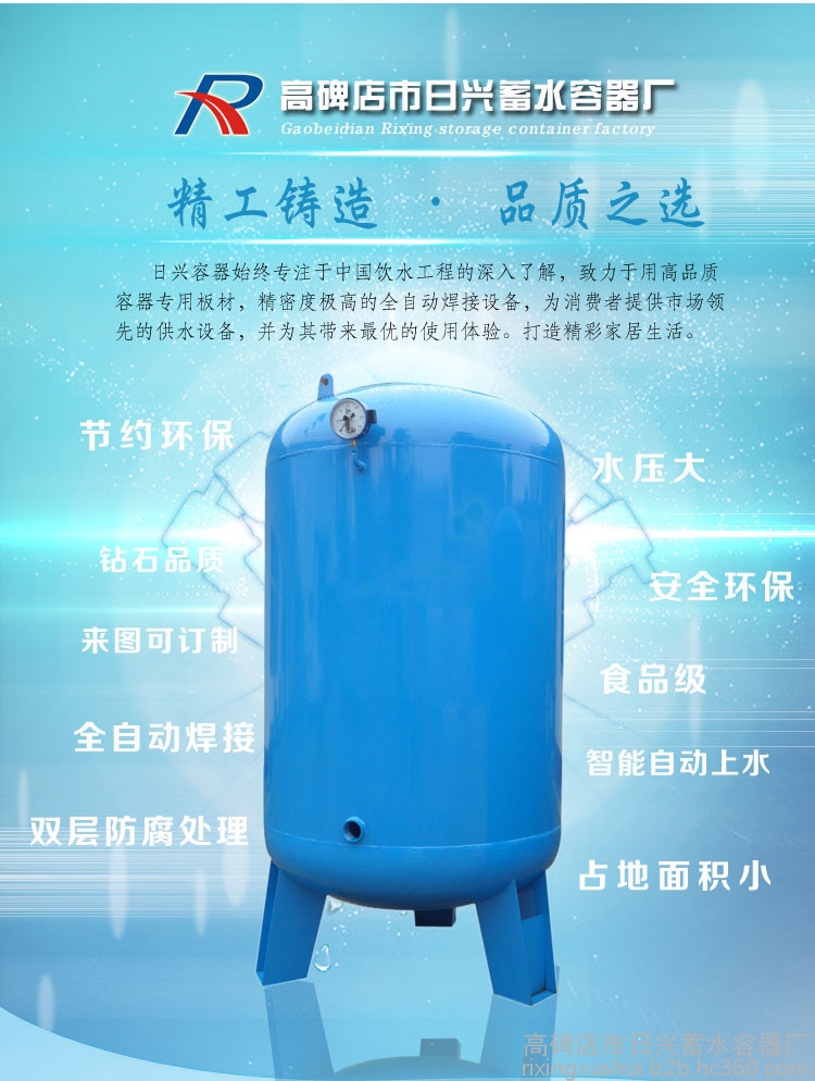压力罐:无塔供水器采用动力设备汲取水到无塔供水容器内,利用空气压缩的原理,形成自然压力,从而实现水资源全封闭存储,增压,输送等全自动供水功能,具有全自动控制,可移动无污染,造价低,寿命长等优势,完全替代了成本高昂,大兴土木的高价水塔和敞开式房顶水塔,实现了供水自动化,智能化。