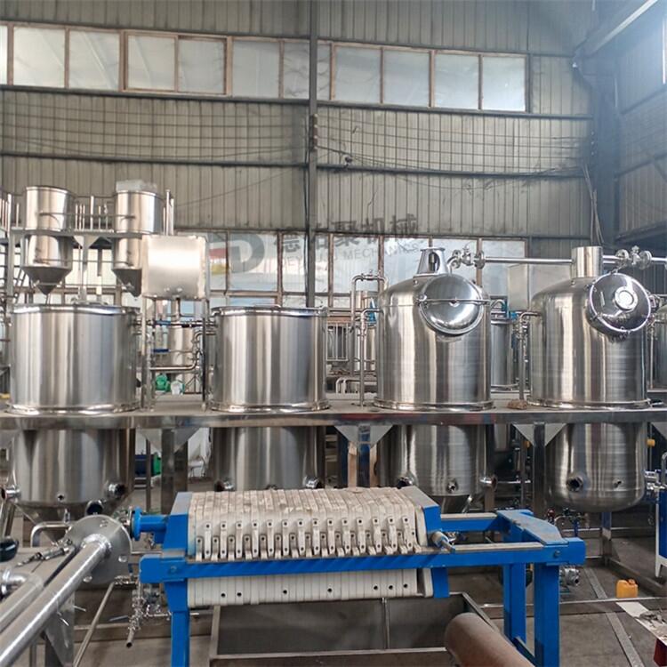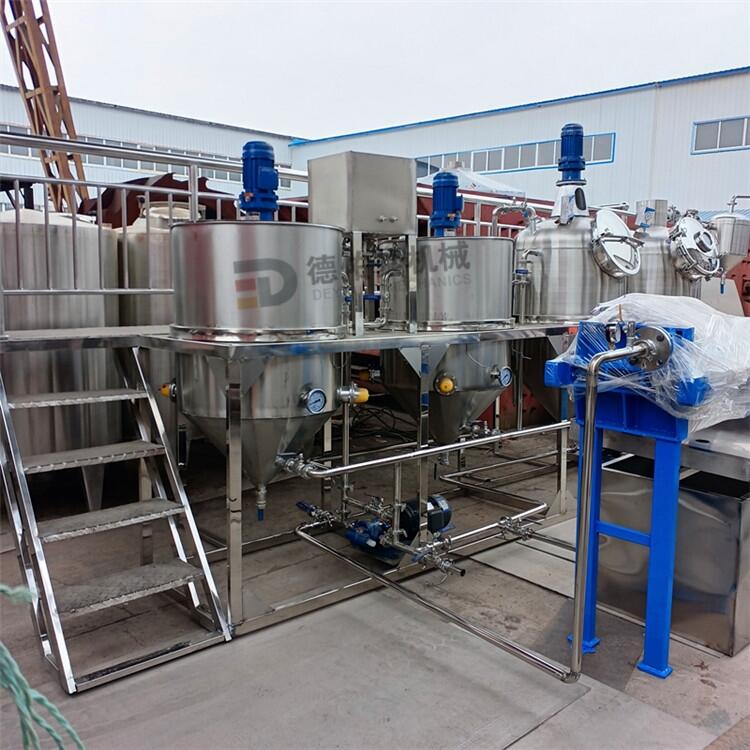 将原油泵入炼油罐进行脱胶和中和。当油和皂脚清晰分离时,迅速下沉,停止搅拌,静止,然后将上层油吸入洗涤槽。小型精炼油设备,皂脚由底部排空管放至皂脚桶,当皂脚含较多油时,停止放皂脚,皂脚由泵打入皂脚罐。炼油罐中剩余的油混入下一罐继续。小型精制油设备,转移至精制油罐的清洗油被水洗,到脱色罐进行吸附脱色。脱色油用泵送到板框过滤器过滤,再转入抛光过滤机进一步过滤,经过冷却器冷却后进入脱色清油灌。脱色后的清油从清油罐通过换热罐吸入除臭罐进行除臭。除臭在3-5托的残余压力下进行。脱臭油放入换热罐后,下一罐脱色清油通过换热罐吸入脱臭罐进行下一次脱臭。小型精制油设备的热交换槽的脱臭油进行热交换后,用冷水蒸发制冷,用泵抽出并研磨过滤,装入成品油槽。