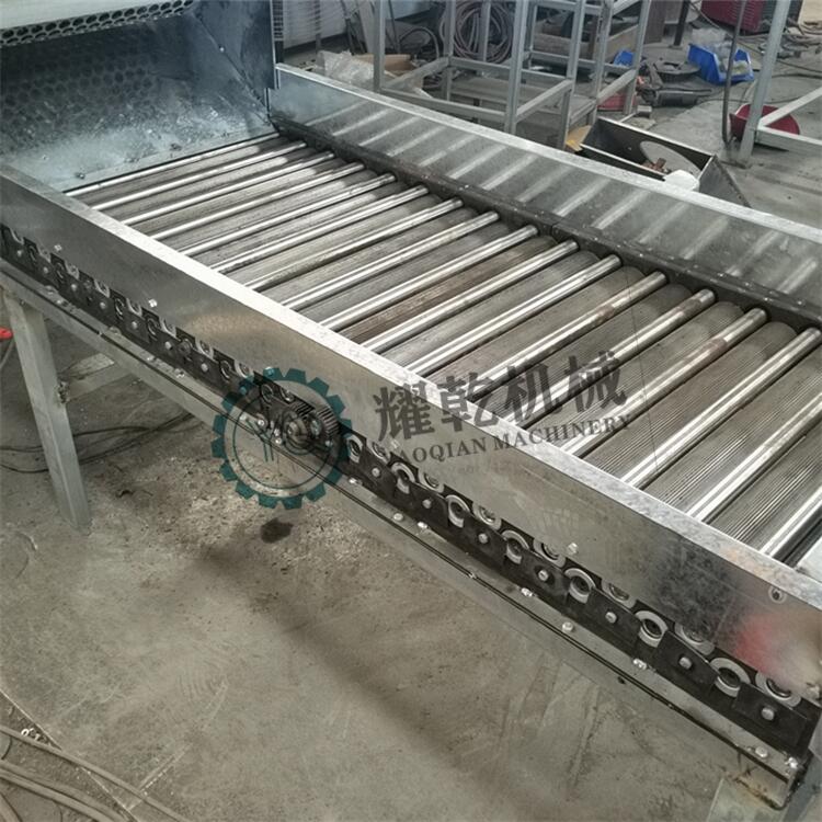 茶果剥壳机将茶籽通过风送上料装置送进进料斗进入前鼓筒内,利用风板转动与圆栅之间的挤压力将茶籽壳剥开,剥开后的茶籽仁与壳同时通过圆栅落下,经过风道时,由上风机风力将大部分茶籽壳吹出机外,同时将未剥开的茶籽仁与部分未剥开的茶籽小果一起落到比重选别筛上进行选别,分离后的茶籽仁由选别筛面向上,经出仁口出。不剥皮的茶籽小果子,由分选晒面下行,经回料口流入提升装置,由风送提升装置送入后鼓筒中进行二次剥皮,剥皮后的仁和壳再由上风机风选,比重分选筛进行精选,如此反复,就可以实现全部剥皮。青皮茶籽剥壳机 新型无损茶籽剥壳机 山茶籽剥壳机