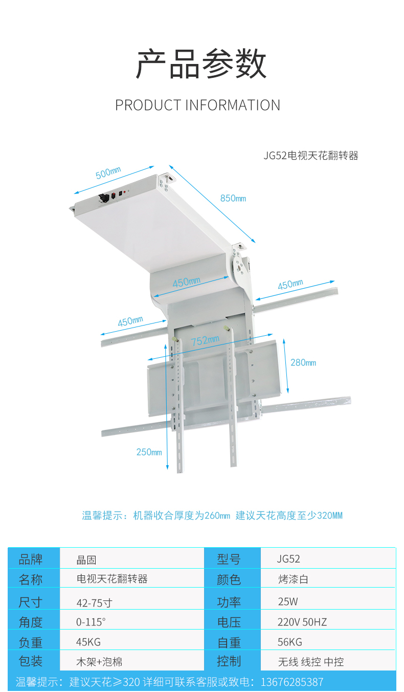 隐藏式电视折叠吊架42-75寸翻转挂架天花齐平电动升降吸顶架