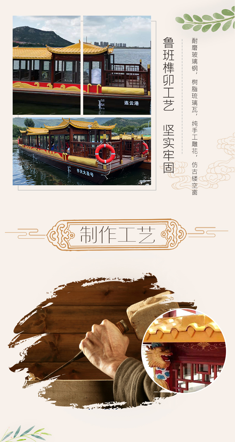 仿古电动14米画舫游览船景区公园餐饮观光45人座接待客船