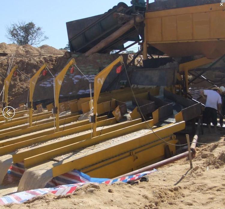 1、2工作流程:挖掘斗由电机驱动实现挖掘上料,卵石经过滚筒筛选滑排河中,小型石和含矿沙混合物通过注水滑沙板进入磁选机进入除铁流程,磁铁粉在高磁环境中被提取进入专用收集舱内,剩余矿砂自磁选设备底部进入两条固定溜槽,在高流速水的作用下形成旋流提取大颗粒沙金,剩余矿料流入两台水套离心机进行精选,精料收集每2-3小时一次。本流程从挖掘、筛选、除铁、粗选到精选工艺简单实用,人力、电力消耗低,黄金提取率高。