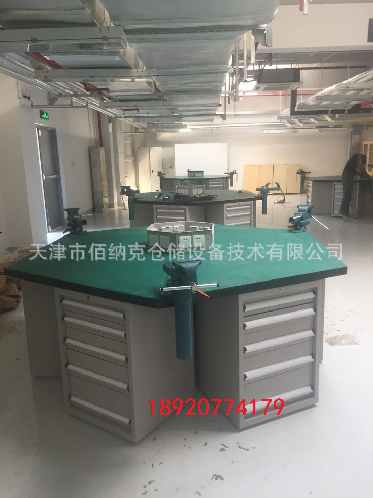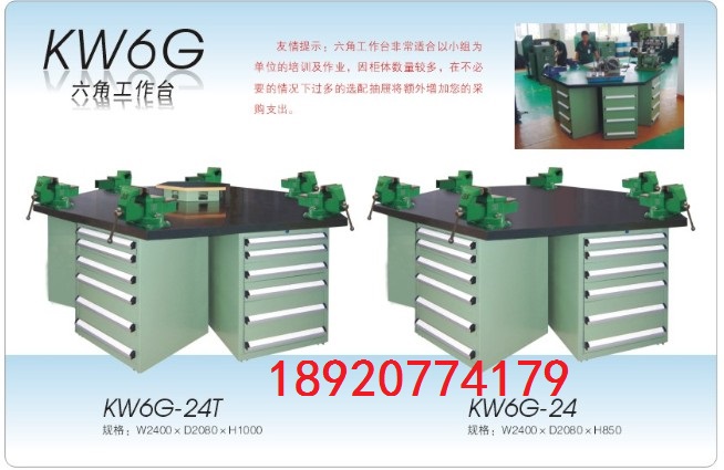六角工作台说明:工作台台面采用50mm绿色复合面,台面总厚度为50mm,台面可以均匀称重1000kg,台面下配置六个重型工具柜,每个工具柜配置五只单轨抽屉,工具柜规格为:564*573*800mm,抽屉高度为2*100mm,1*135mm,1*160mm,1*200mm,台面上配置一个小六角台面,台面规格为600*520mm,每个面配置两个220V五孔插座和一个气路接口,台面下配置重型横梁。材质采用优质冷轧钢板,表面酸洗磷化后,采用静电喷塑处理,颜色:除台面外整体采用电脑灰RAL7035;配置2mm防静电胶皮.