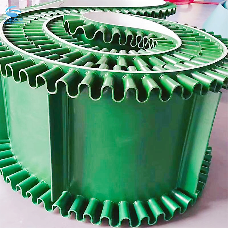 裙边输送带在工业应用中主要起到防止产品往两侧滑落的作用,主要用在输送粉末状、颗粒状、小包装等小物料的输送上。